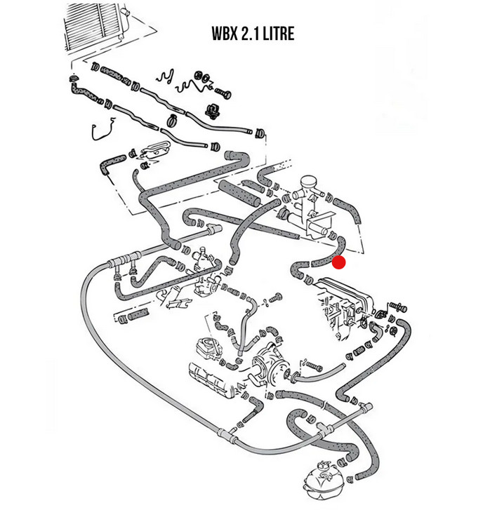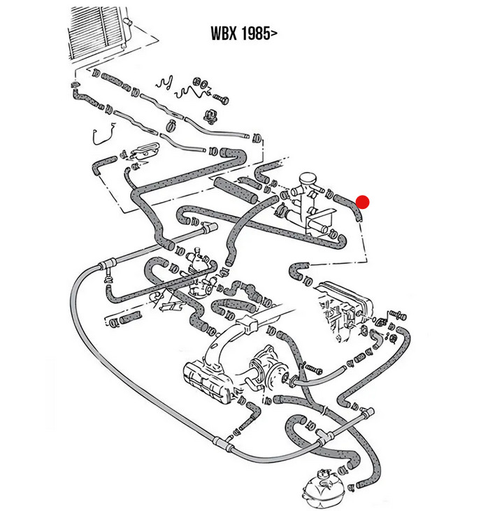 H?t?folyadék töml?, amely a jobb oldali hengerfejet a m?anyag vízelosztóval köti össze.