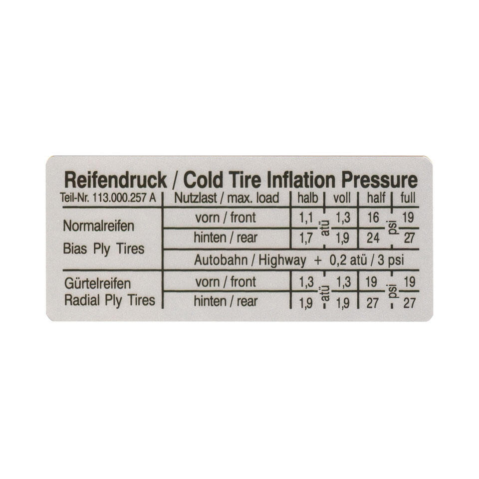 Sticker, tire pressure table